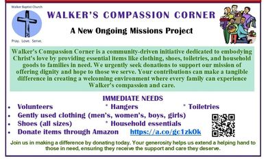 A new ministry of Walker is beginning October 1. We are collecting items that are needed by individuals and families living in the Walker community and setting up a distribution "corner". This will be an ongoing project housed in the former RA room on second floor. We need you! Talk to Karen for more specific information.